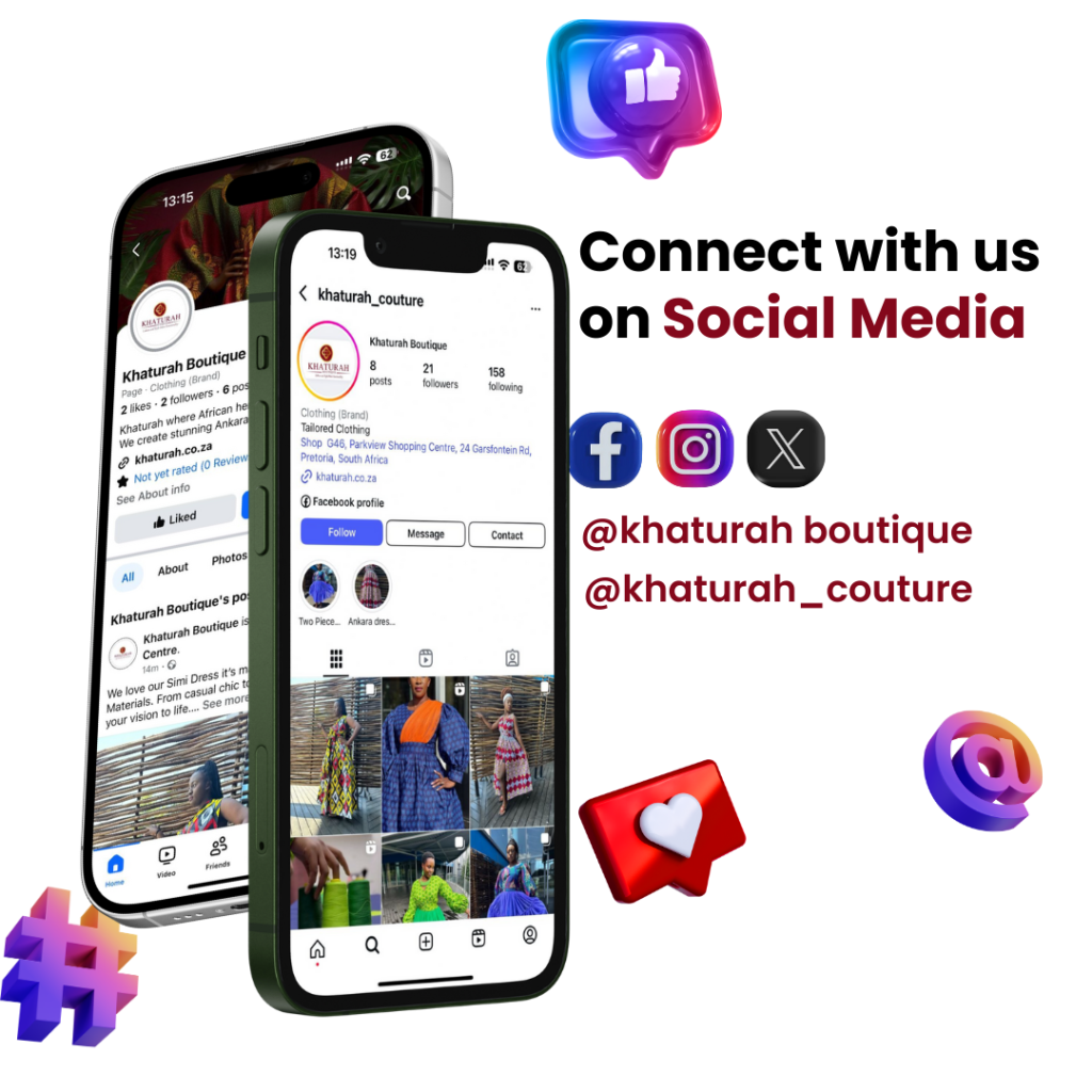Whether it’s a bold statement piece, a show-stopping outfit, or something special for a big occasion, we’re here to make it happen. Pop by our boutique in Pretoria or send us a message—let’s chat, sketch, and create something truly one-of-a-kind, just for you. At Khaturah, your dream outfit is just a conversation away! 🧵✨